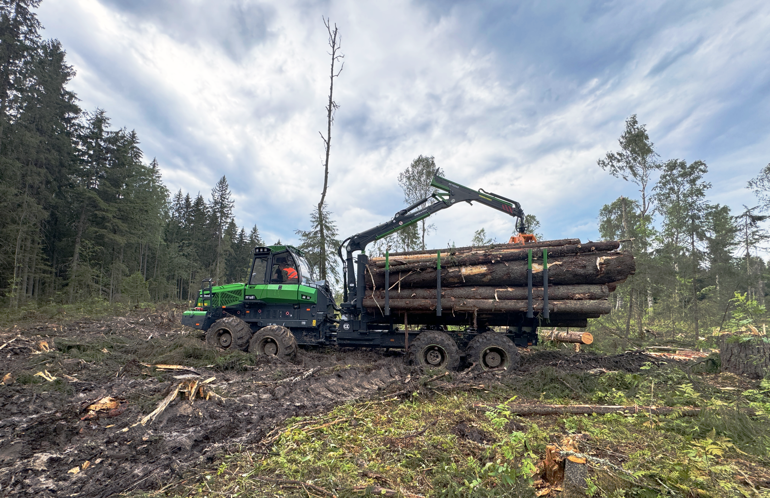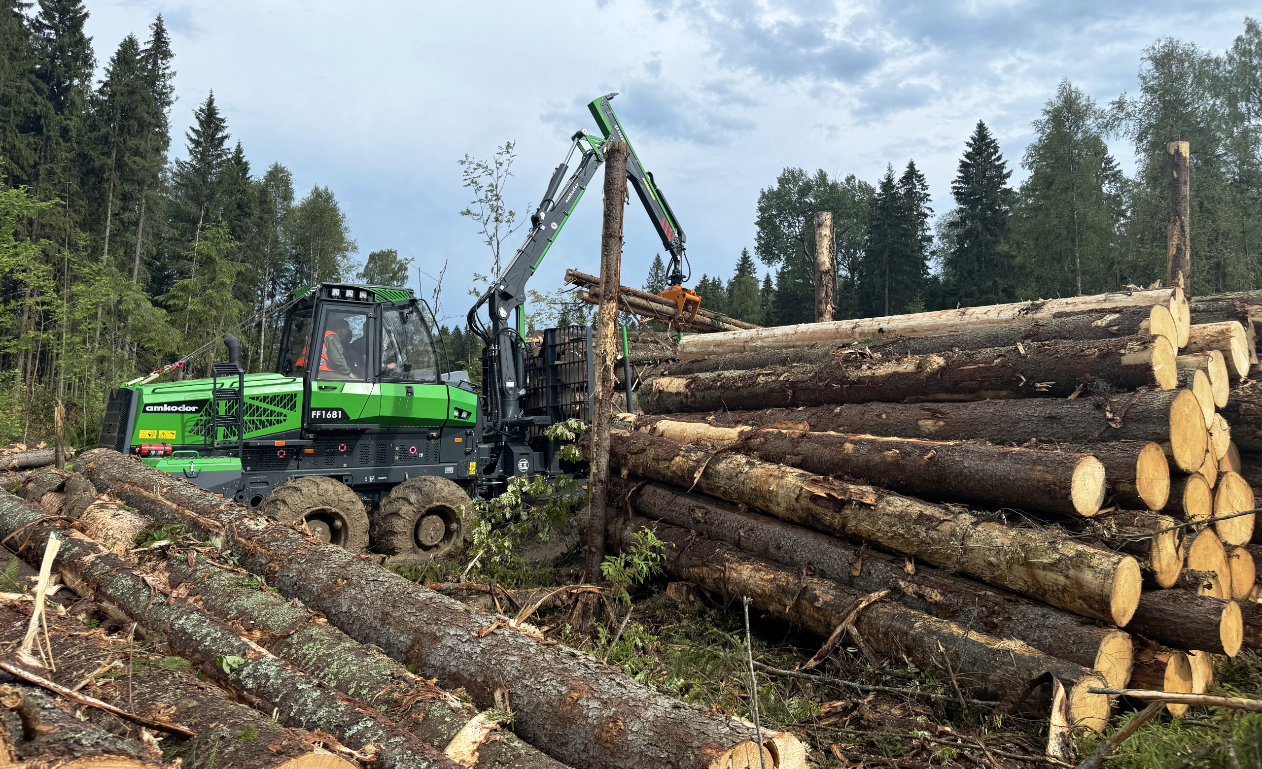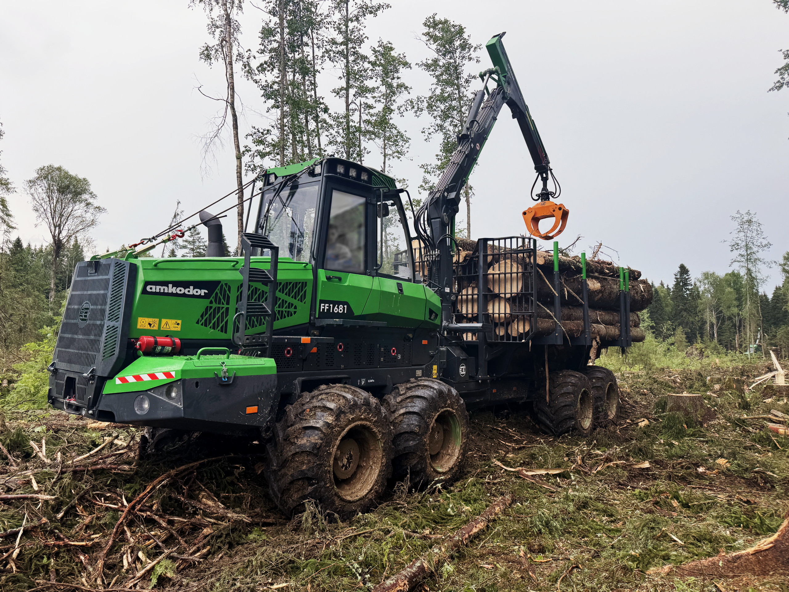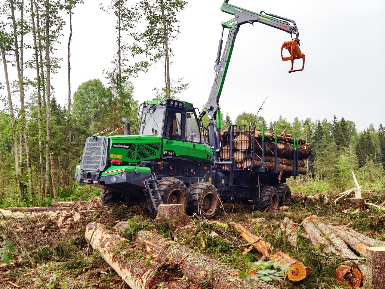 Форвардер AMKODOR FF1681 – инновационная машина тяжелого класса повышенной производительности, предназначенная для сбора, погрузки и транспортировки по территории лесосек, по волокам и лесовозным дорогам сортиментов и других круглых лесоматериалов, а также для выполнения погрузочно-разгрузочных работ, операций сортировки и складирования древесины при проведении рубок главного пользования. Имеет широкий диапазон опций: удлинитель грузового отсека, уширители грузового отсека, систему продольного перемещения щита, отвал, лебедку, систему блокировки балансиров тандемных мостов.